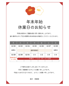 年末年始のお知らせ 2025.12.04 侑備堂の漢方ブログ, 店舗お知らせ, 新着情報 年末年始のお休みは 12/30(火)-1/5(火) までとなります。 また、12/29(月)は特別営業日となりますが混雑が予想されるためお買い物のみとなり、 ご相談の枠をご用意しておりません。 ご相談希望のお客様は大変ご不便おかけし申し訳ありませんが、12/27(土)までのご予約をお願いいたします。 « 11/24 漢方ベビーちゃん