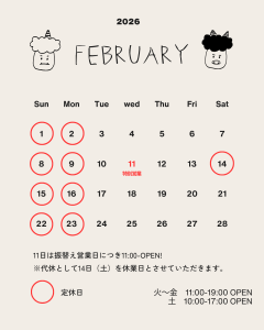 2/11は特別営業日となります 2026.02.05 侑備堂の漢方ブログ, 店舗お知らせ, 新着情報 【2月の営業変更日】 2/11(水・祝)は特別営業日となり11時~営業 2/14(土)は振替休業となります。 その他2/23(月・祝)は通常通りの定休日となりますのでご確認の上ご来店をお願い致します。 « 1/30 漢方ベビーちゃん