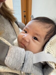 2カ月弱なのですが、もうすでによく笑い感情が豊かでご機嫌よく、お母さまから「こんなに育てやすい子は見たことない」とびっくりされたそう